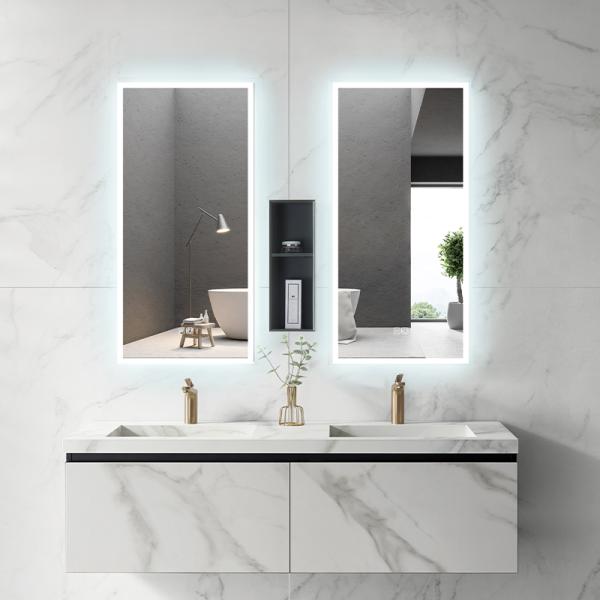 This bathroom mirror has many considerate designs in terms of functionality. The LED light strip at the edge of the mirror, in addition to creating an atmosphere, also has a good lighting function, supplementing the light in the bathroom space and making operations such as washing and makeup clearer and more convenient. The niche-style design in the middle, combined with the mirror to form an organic whole, not only makes use of the gap between the mirrors but also provides a practical storage space for placing small items such as aromatherapy and toiletries, making the items within easy reach while keeping the countertop tidy.